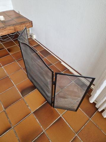Dit is een drieluik venster voor een open haard. Het is gemaakt van zwart metaal met gaas. Het venster heeft drie delen die scharnieren, zodat het makkelijk te plaatsen is voor de haard. Hoogte zijka