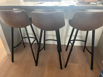 Bruin leren barkrukken. 3 Stuks, 73 cm zithoogte. Zijn wel beschadigd maar zitten prima