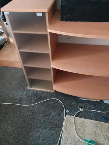 Dit is een kastje met glazen deurtjes aan de zijkant. Het heeft meerdere planken voor opbergruimte. Het kastje is van houtkleurig materiaal. Allen ophalen.