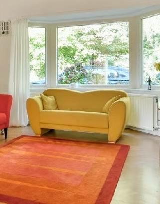 Een gele tweezitsbank met een golvende rugleuning. De bank heeft een stoffen bekleding en staat op lage poten. Er ligt een klein geel kussen op de bank. Breedte: 160cm diepte: 82cm