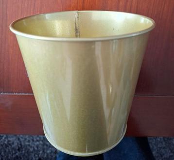 Een goudkleurige bloempot, gemaakt van metaal. De pot heeft een ronde vorm en is geschikt voor binnen. Er zijn wat kleine gebruikssporen zichtbaar aan de binnenkant. Bovenste diameter 12,5 cm hoogte 1