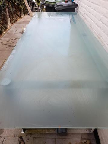 Dit is een glazen tafelblad. Het blad is rechthoekig en heeft een matte afwerking. Het is een los blad, zonder onderstel. 2.40 M bij 90 cm g4at8s