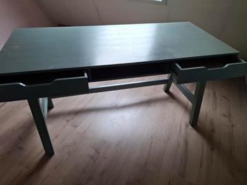 Dit is een grijsgroen bureau. Het bureau heeft twee lades en een open vak in het midden. De lades zijn zonder handgrepen.