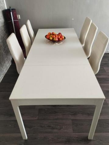 Mooie witte uitschuifbare eettafel van ikea, ideaal voor zowel dagelijks gebruik als voor grotere gezelschappen. De tafel is eenvoudig te verlengen van 180 cm naar 240 cm. Perfect voor een modern inte