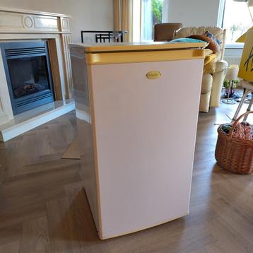 Een tafelmodel koelkast met een klein vriesvak. De koelkast heeft twee glazen planken en een lade onderin. In de deur zitten drie vakken voor flessen en kleinere items. De afmetingen zijn 40x40x75 cm
