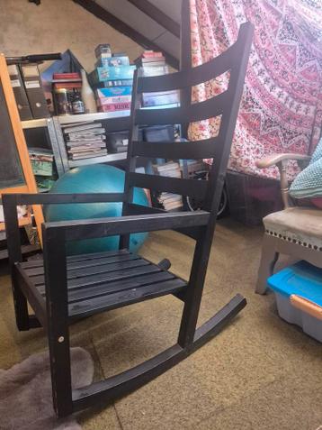 Schommelstoel. Zit stevig in elkaar. Er zijn wel wat gebruikerssporen zichtbaar op het hout. De stoel is zwart van kleur.