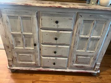 Grenen kast met een geverfde afwerking. De kast heeft twee deuren en vier lades in het midden. De afmetingen zijn 125 cm lang, 55 cm breed en 90 cm hoog.