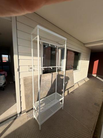 Witte metalen kapstok met twee planken en een roede. Er zitten ook haken aan de zijkant. Handig voor jassen en schoenen. Vandaag ophalen