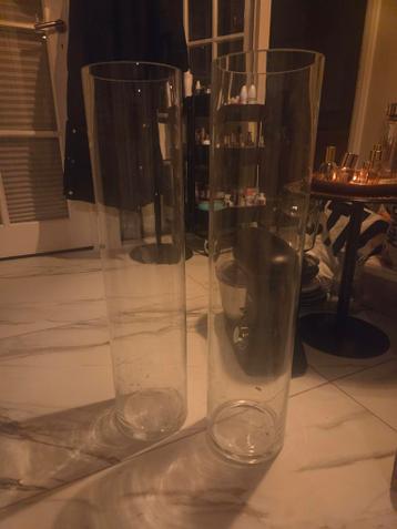 Set van twee elegante, grote ronde glazen vazen. Deze vazen zijn perfect voor het tentoonstellen van lange bloemstukken, decoratieve takken of als stijlvolle vloervazen. Ze zijn gemaakt van helder gla