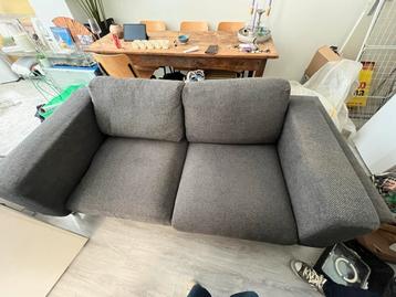 Een grijze driezitsbank met stoffen bekleding. De bank heeft twee zitkussens en twee rugkussens. De armleuningen zijn breed en de bank staat op lage poten. De kleur is donkergrijs. Deze bank is nog zo