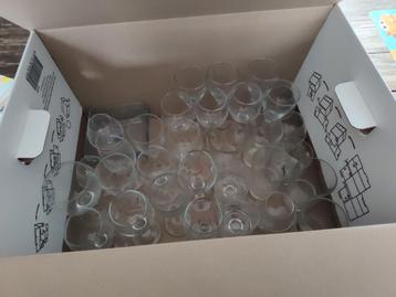 Een doos vol met diverse glazen, zoals bier-, wijn-, whiskey- en cognacglazen. Er zitten ook twee kleine schaaltjes bij. Alles is gebruikt, maar nog prima in orde.