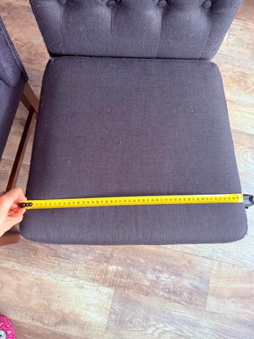 Twee eetkamerstoelen met stoffen bekleding. De stoelen zijn donkergrijs van kleur en hebben houten poten. De zitting is ongeveer 46 cm breed en 46 cm diep. De totale hoogte van de stoel is ongeveer 10