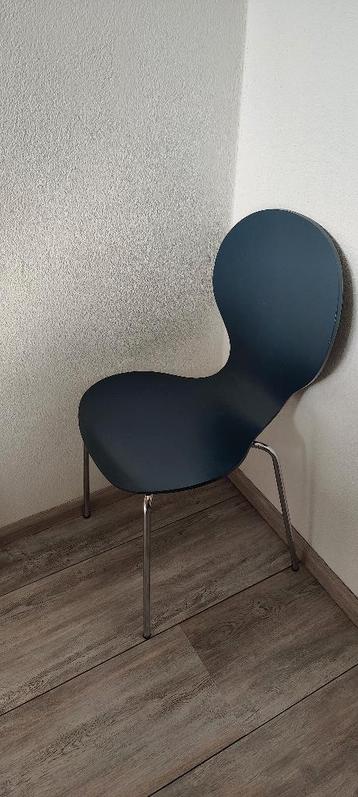 Houten stoel met metalen poten voor bijvoorbeeld een bureau. Donker blauw geverfd. Schoon en onbeschadigd. Ongeveer 87 cm hoog en 43 cm breed.