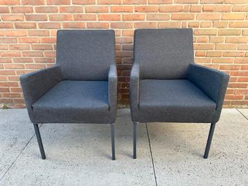 Twee eetkamerfauteuils met stof (wolvilt) in de kleur antraciet. De poten zijn in ral 7024. De stoelen zijn gebruikt en hebben lichte gebruikssporen, zoals te zien op de foto's. Ze zijn nog stevig