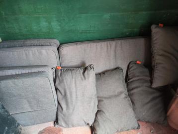 Hierbij bied ik een set tuinkussens aan. Het zijn grijze kussens, sommige zijn zitkussens en andere zijn rugkussens. Ze hebben een oranje labeltje aan de zijkant.