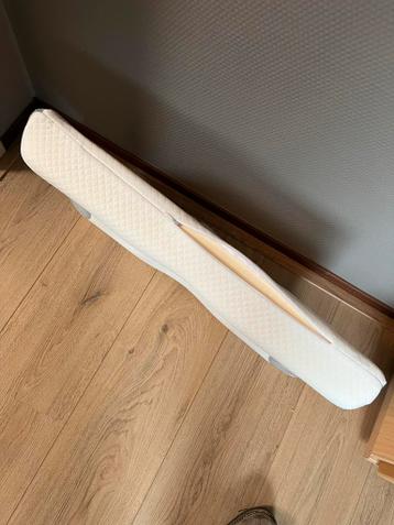 Dit is een wit kussen met een patroon en grijze accenten aan de zijkanten. Het kussen heeft een rits aan de zijkant. De vorm is niet standaard rechthoekig.