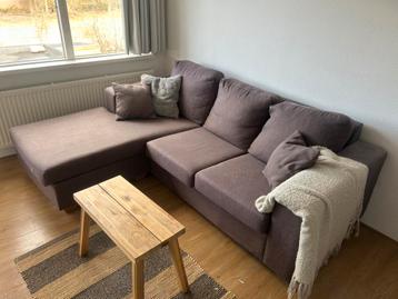 3 zits hoekbank, ongeveer 220 cm breed. Een armleuning is een beetje doorgezakt. Bank staat op 1e verdieping (poten moeten eraf om naar beneden te krijgen)