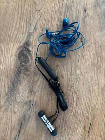 Set van twee bedrade oordopjes. Eén paar is blauw en heeft een standaard 3.5Mm jack. Het andere paar is zwart/zilverkleurig en heeft een micro-usb aansluiting, mogelijk voor een oudere telefoon of spe