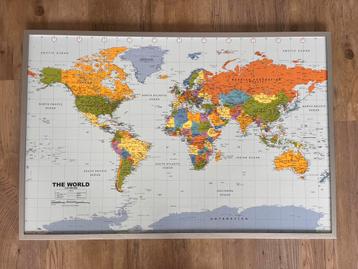Wereldkaart op kurk met vlaggetjes die je erin kunt prikken om te laten zien waar je al geweest bent of waar je nog heen wil. In goede staat, al zitten er natuurlijk wel wat gaatjes in waar ik hem al