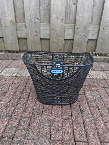 Een zwarte fietsmand van basil. De mand is van metaalgaas en heeft een bevestiging voor aan het stuur. De mand is gebruikt.