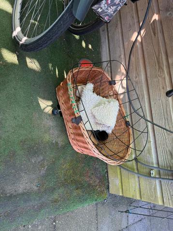 Een fietsmand van riet met een metalen frame. De mand is bruin en heeft een zwart metalen rooster aan de bovenkant. Er zit een wit kleedje in.