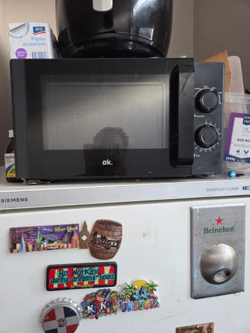 Een zwarte magnetron van het merk ok. Het is een vrijstaand model met draaiknoppen voor de bediening. De magnetron heeft een handvat aan de zijkant van de deur.