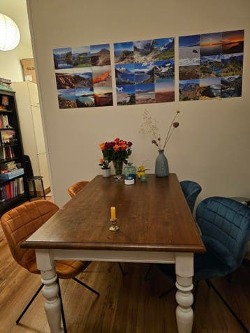 Ik verkoop deze tafel omdat ik een hoog/laag bureau heb gekocht welke ik eveneens als eettafel gebruik. De tafel is 150x90cm. En 77cm hoog. En voor diverse doeleinden te gebruiken. De tafel is vrij li