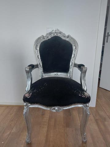 Deze barok stoel is gratis af te halen. Het is een opknappertje, de zitting en rugleuning zijn beschadigd. Het frame is zilverkleurig.