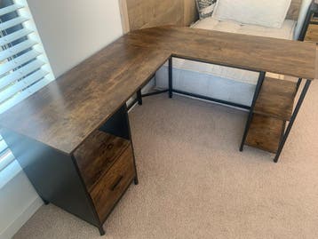 Mooi hoekbureau van 137 cm bij 151 cm en 75 cm hoog. Het bureau heeft een lade en twee open planken aan de zijkant. Ziet er nog netjes uit.
