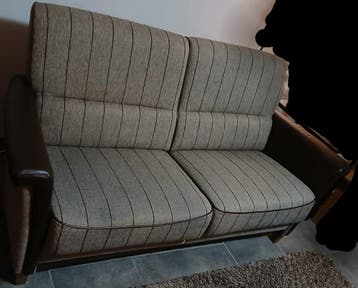 Een bank met een stoffen bekleding in een lichte kleur met strepen. De armleuningen zijn donkerbruin en lijken van leer of kunstleer te zijn. De bank heeft twee zitkussens en twee rugkussens.