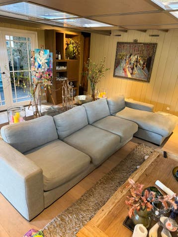 Licht blauwe bank. Heeft gebruikers sporen en een scheur. Vandaar gratis af te halen. L385 cm b105 cm b160 cm. Losse kussens