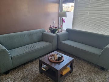 Twee tweezits banken van 190cm breed, 83cm diep en 80cm hoog. De banken zijn in gebruikte staat met wat beschadigingen en moeten worden schoongemaakt. De kleur is groen met blauw en grijs. Ze zitten n