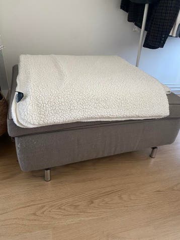 Mooie hocker. Zelf ooit tweedehands gekoct, kan nog een ronde mee. Wel wat gebruikssporen, maar met een leuk kleed erover heen is dat niet zichtbaar. Of leuk om opnieuw te bekleden 89 cm x 74 cm x h 4