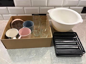 Diverse keukenartikelen gratis af te halen: een set mokken, verschillende soorten bekers, onderzetters en een handige mengkom. Alles in één keer op te halen.