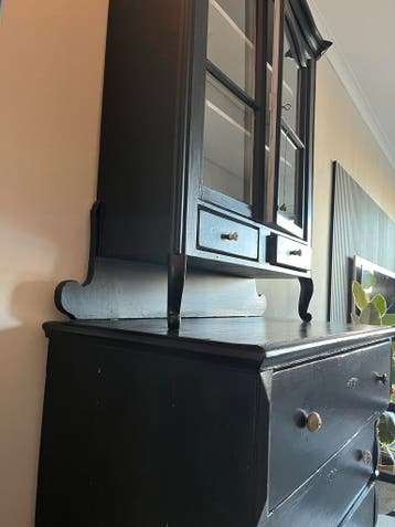 Deze zwarte service kast heeft een bovenkast met glazen deurtjes en twee kleine lades. De onderkast heeft drie grotere lades. De binnenkant van de bovenkast is wit de kast is 220cm hoog en 120cm breed