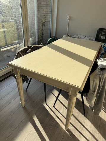 De tafel heeft een likje verf nodig om er weer stralend uit te zien. Eén van de poten is ingescheurd, wat gerepareerd moet worden.