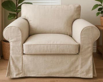 Een beige ektorp fauteuil met chenille stof. De stoel heeft een klassieke uitstraling en een comfortabele zitting. De hoes is afneembaar.