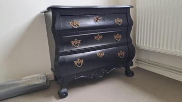Gratis af te halen 2 zwarte buikkastjes 1 heeft 3 lades, de ander heeft 1 la en 1 klep de kastjes hebben een beetje aandacht nodig, zo zit het beslag van 1 kastje niet helemaal meer vast, maar zoals o