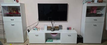 Deze complete woonkamerset bestaat uit een modern wit tv-meubel en twee bijpassende vitrinekasten. Het tv-meubel biedt voldoende ruimte voor uw televisie en media-apparatuur, met handige opbergvakken