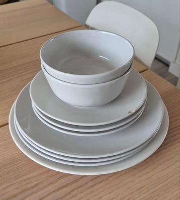 Set van witte borden en kommen. Het servies is gebruikt en vertoont lichte gebruikssporen, waaronder een kleine beschadiging aan één van de borden, zoals te zien op de foto's.