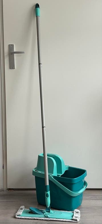 Compleet dweilsysteem, gratis af te halen. Ideaal voor het snel en efficiënt schoonmaken van alle harde vloeren. De set bestaat uit een dweil met steel en een bijpassende emmer met uitwringfunctie. Pe