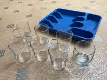 In verband met het opruimen van mijn keukenkastjes heb ik 6 thee glazen, 1 sapglas en een plastic bestekbak over. Alles zoals afgebeeld in 1x meenemen.