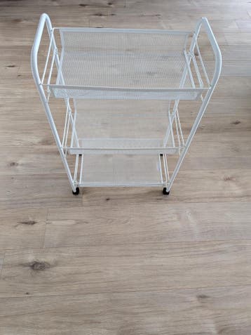 Dit is een wit metalen rekje met drie lagen. Het rekje staat op wielen, dus je kunt het makkelijk verplaatsen. Het is handig voor spullen in op te bergen.