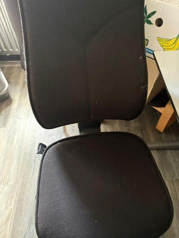 Een zwarte bureaustoel met een stoffen bekleding. De stoel heeft een rugleuning en een zitting. Er zijn wat lichte gebruikssporen zichtbaar op de stof, zoals wat pluisjes.