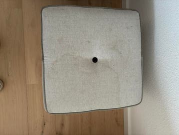 Deze vierkante poef is bekleed met een lichtgekleurde stof met een visgraatpatroon. Er zit een knoop in het midden van de bovenkant. De onderkant is zwart met hoekbeschermers. Bovenkant heeft een vlek