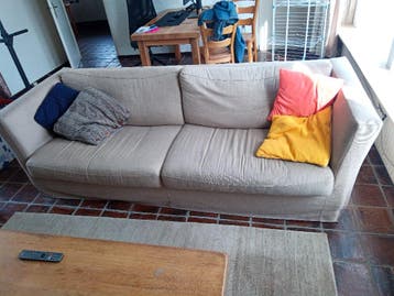 Gratis af te halen: lichtbruine bank. De bank is gebruikt en heeft zichtbare gebruikssporen, maar zit nog prima en is nog goed te gebruiken. Ideaal als tijdelijke oplossing, voor een studentenkamer of