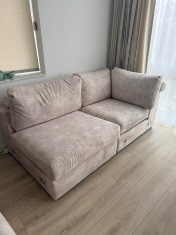Twee losse delen van een bankstel. De delen zijn bekleed met een lichtbeige stof. Ze kunnen aan elkaar gekoppeld worden om een hoekbank te vormen. De kussens zijn zacht en de bank staat op kleine poot
