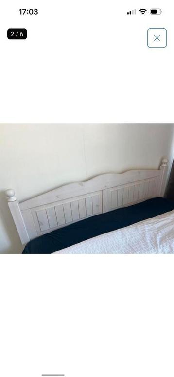 Leuk en stevig houten tweepersoonsbed in witte kleur. De breedte is 140 cm en het bed wordt geleverd met lattenbodems. Inclusief matras (17 cm hoog) en molton. Het matras heeft wel wat vlekken (zie fo