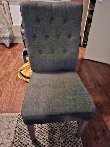 Comfortabele grijze eetkamerstoel, gebruikt maar in goede staat. De stoel is gestoffeerd en heeft een klassiek ontwerp met knopen in de rugleuning. Perfect voor aan de eettafel of als extra zitplaats.
