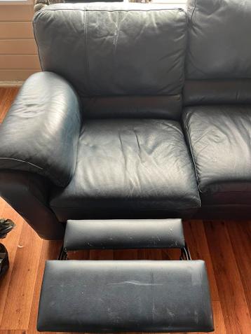 Nog prima leren bank voeten steunen verstelbaar. Donker blauw. Geen scheuren in het leer.